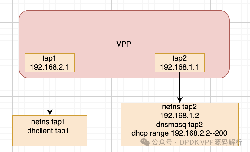 接下来,搭建环境学习一下基本转发流程,组网图如下:我们创建2个命名空间tap1和tap2,tap1模拟PC客户端,tap2模拟远程dhcp 服务器。vpp作为DHCP中继代理。