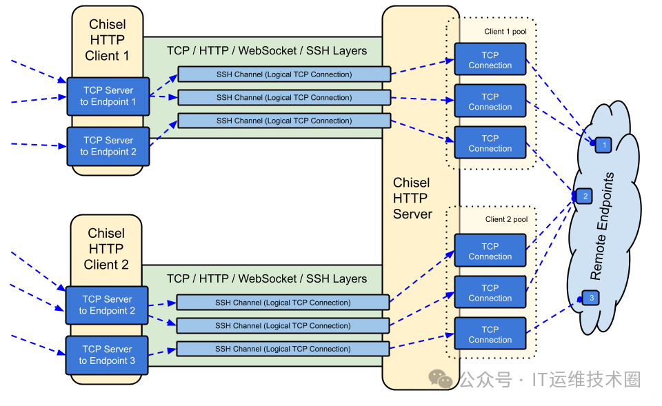 Chisel 是一个开源的、跨平台的、用 Go 编写的简单工具,用于创建 TCP/UDP 隧道和 HTTP 隧道。它旨在通过代理、NAT 或防火墙等限制性网络环境,帮助用户进行安全的数据传输。Chisel 本质上是一个反向代理工具,搭建在 WebSocket 之上,提供了加密和压缩功能。