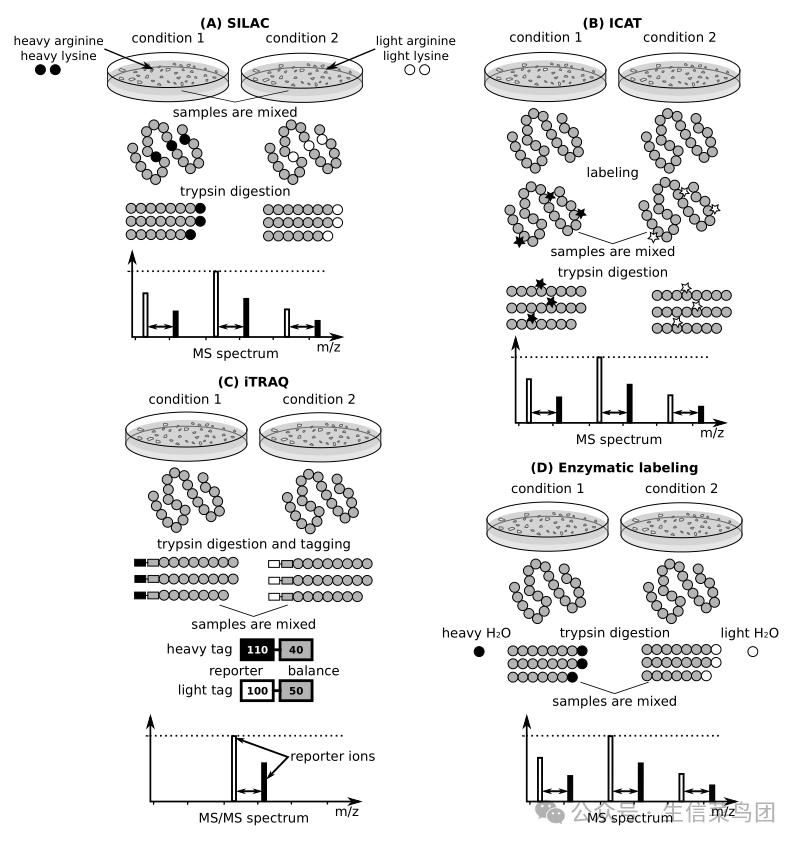 许多生物学或临床问题需要比较两种或更多不同条件下的情况。因此,质谱(Mass Spectrometry, MS)需要能够比较不同条件下的蛋白质数量,或至少是相对数量。蛋白质组消化产生的肽数量与 LC-MS/MS 系统的分析能力(即可以分离、检测和鉴定的成分数量)之间存在显著差异,这使得在同一样本的重复分析中无法获得完全可重复的肽集合。因此,使用 MS 进行定量蛋白质组学是一项特别具有挑战性的任务。为克服这些限制,开发了不同的方法(参见 Bantscheff 等人, 2007;Elliott 等人, 2009)。第一种方法是细胞培养中的氨基酸稳定同位素标记(Stable Isotope Labelling with Amino acids in Cell culture, SILAC)(见图 3.21A 和 Ong 等人, 2002),它依赖代谢标记,使用轻型或重型的精氨酸和赖氨酸来表示两个不同的条件。由于胰蛋白酶在精氨酸或赖氨酸之后切割蛋白质,因此可以确保水解后得到的所有肽段至少携带一个标记的氨基酸。因此,不同条件下的相同离子会产生质量差异。此技术需要培养细胞,因为标记是在细胞生长期间发生的。由于并非总是能够进行细胞培养,第二种方法称为通过酶反应引入稳定同位素(Enzymatic labelling),允许在胰蛋白酶水解过程中,使用轻 H₂O 或重 H₂O 标记肽 C 端(见图 3.21D)。第三种方法是同位素编码亲和标签(Isotope-Coded Affinity Tag, ICAT),该方法中,将试剂添加到半胱氨酸残基上(见图 3.21B 和 Gygi 等人, 1999)。在 MS 谱图中会观察到一个位移,不同条件下峰高度的比率表示两者之间的相对数量。为了获得更可靠的结果,可以计算 MS/MS 谱图进行验证。第四种方法允许同时比较两个以上的条件,即相对和绝对定量的同位素标签(Isobaric Tag for Relative and Absolute Quantitation, iTRAQ),它在所有肽段的 N 端附加一个特定标签来表示每个条件(见图 3.21C 和 Ross 等人, 2004)。每个标签由一个报告组和一个平衡组组成。由于所有标签的质量相同,每个条件的报告组和平衡组的质量组合都被设置为特定值。在碎裂步骤中,这些标签分解为报告离子和平衡产物离子。因此,从 MS/MS 谱图中可以通过报告峰的相应 m/z 值识别每个条件,并可以从峰高度的比率推导出相对蛋白质数量。由于上述方法中的样本制备依然是一项繁琐的任务,已经提出了生物信息学算法来校正固有的偏差和变化来源,以便定量蛋白质组学可以用于经典的 MS 和 MS/MS 实验(Griffin 等人, 2010)。这些依赖生物信息学算法的方法被称为无标记定量质谱(label-free quantitative MS)。