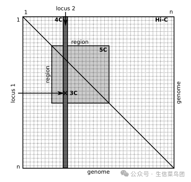 图 3.17 基于 3C 方法的示意表示 在 Hi-C 实验中,数据可以表示为一个对称矩阵,其中一行和一列分别对应于两个不同的位点,使得所有行和列覆盖整个基因组。对于矩阵中的一个单元格(即一对位点),可以赋予一个从 0 到 1 的值,表示它们相互作用的频率。3C、4C 和 5C 分别对应于矩阵中的一个单元格、一行和一个子矩阵,而 Hi-C 获得的是整个矩阵。