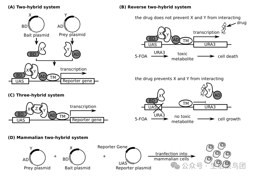 图 3.22 酵母和哺乳动物双杂交系统的原理 (A) 在酵母双杂交系统(Yeast Two-Hybrid system)中,猎物和诱饵质粒都被转染到酵母中。如果蛋白质 X 和 Y 物理上相互作用,报告基因将被转录。 (B) 在反向酵母双杂交系统中,报告基因的转录对酵母是致命的。在此例中,URA3 基因编码的蛋白质将分子 5-FOA 转化为有毒代谢物。如果 X 和 Y 发生相互作用,酵母细胞在存在 5-FOA 的情况下会死亡(上图);而如果一种药物阻止 X 和 Y 的相互作用,在存在 5-FOA 的情况下可观察到细胞生长。 (C) 在酵母三杂交系统中,如果 X 和 Y 都与第三种已知蛋白 Z 相互作用,则报告基因将被转录。 (D) 在哺乳动物双杂交系统(Mammalian Two-Hybrid system)中,猎物和诱饵质粒与酵母双杂交系统一样被转染到哺乳动物细胞中。此外,还转染了一个包含 UAS 区域的报告质粒,该质粒自然存在于酵母中。TM:转录机器(Transcription Machinery);UAS:上游特异性激活序列(Upstream specific Activation Sequence)。图片及说明改编自 Suter 等人 (2008);Causier (2004);Lievens 等人 (2009);Luo 等人 (1997)。
