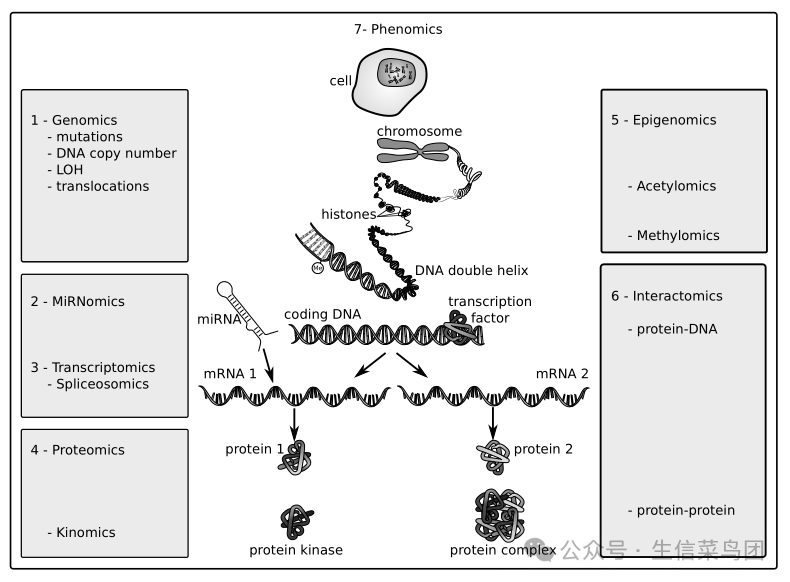 理解肿瘤进展并改进肿瘤分类需要揭示在这些不同分子层次上发生的变化。当前的生物技术使我们能够精确描述每个肿瘤样本的分子特征,且信息检索必须尽可能详尽。例如,我们的目标是在每条染色体上尽可能多地确定 DNA 拷贝数,量化所有已知基因的信使 RNA(mRNA)表达,检测存在的可变剪接形式等。虽然对于某些分子特征来说,这种详尽搜索可能是可行的,但对于某些情况(特别是蛋白质),由于复杂性和技术原因,这是不可行的(参见第 3.4 节)。由于分子特征的定量应该尽可能详尽,允许进行这些测量的技术通常被称为基因组范围(genome-wide)技术。通常,这种研究特定类型分子特征的技术名称是将所研究的分子实体或生物功能与后缀 -omics 连接。例如,如图 3.1 所示,基因组学(genomics)研究 DNA 的改变(突变、拷贝数等),miR 组学(miRNomics)研究 microRNA(miRNA)表达,转录组学(transcriptomics)研究 mRNA 表达,剪接组学(spliceomics)研究不同的可变剪接形式,蛋白质组学(proteomics)研究不同的蛋白质,激酶组学(kinomics)研究蛋白激酶的磷酸化状态,表观遗传组学(epigenomics)研究表观遗传修饰,互作组学(interactomics)研究不同分子实体之间的相互作用,而表型组学(phenomics)研究细胞可观察的特征。后缀 -omics 来自希腊词根 omes,表示“所有、每一个、整体或完整的”,提醒我们这些技术旨在实现详尽搜索。这些技术也被称为高通量(high-throughput)技术,因为它们在短时间内产生大量信息。值得指出的是,除了高通量技术外,还有其他方法或技术,但本书中不作讨论。在本章中,将详细介绍与 -omics 技术相关的技术细节。