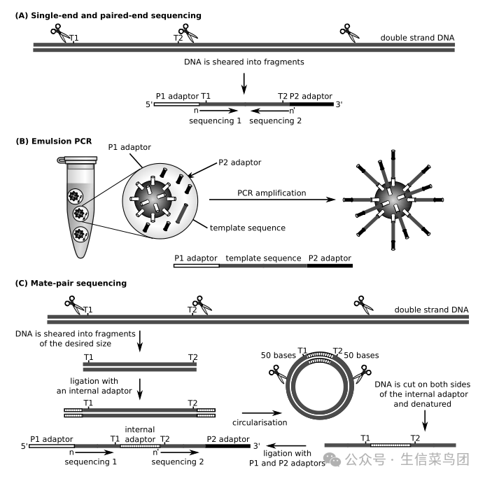 图 3.12 SOLiD 平台的文库构建 (A) 对于单端测序和双端测序,DNA 被剪切成片段(片段或模板的两端 T1 和 T2 的长度范围为 150 到 180 bp)。单端测序进行一个测序步骤(从位置 ),双端测序进行两个测序步骤(从位置 和 )。 (B) 创建油-水乳液以包封直径为 1 微米的珠子,珠子上带有 P1 和 P2 适配器以及单一模板。乳液 PCR 在微滴内进行后,珠子包含了几千个初始模板序列的拷贝。 (C) 在 mate-pair 文库中,根据所需大小选择 DNA 片段(例如,选择两端 T1 和 T2 的片段大小为 3 Kb)。然后在片段的两端连接一个内部适配器,DNA 被环化并在内部适配器的两侧被切割,使得两个生成的模板长度均为 50 个碱基。进行两个测序步骤。 以上内容改编自寡核苷酸连接与检测测序(SOLiD™)文档。