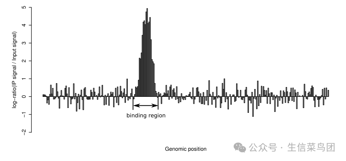 图 3.10 ChIP-on-chip 图谱 沿基因组表示 IP 信号与输入信号之间的 比值。POI 的 DNA 结合区域在基因组图谱中显示为一个峰值。