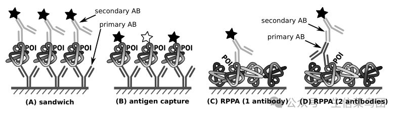 为应对蛋白质组的复杂性,基于免疫测定实验的研究方法得到了广泛的发展。在这种情况下,蛋白质组学研究依赖抗体,而抗体是免疫系统用于识别外源生物(如病毒、细菌)中特定抗原(如蛋白质)的分子。抗体拥有一个特定且高度可变的结构域,可以适应识别宿主生物体在其生命过程中遇到的任何潜在抗原。生物技术方法可以制备出能够靶向特定蛋白质(Protein of Interest, POI)的抗体,但确保其特异性和敏感性是一项复杂的任务。因此,在人类可能存在的数百万种蛋白质形式(包括其翻译后修饰 PTM)中,只有几千种抗体可以靶向某些特定的蛋白质。微阵列技术与免疫测定方法结合,以便在生物样本中实现蛋白质的高通量定量。然而,由于制备和使用抗体的困难,微阵列的通量仍然低于基于核苷酸的微阵列。以下是允许蛋白质水平相对定量的三种微阵列方法(MacBeath, 2002;Tomizaki 等人, 2010;LaBaer 和 Ramachandran, 2005;Spurrier 等人, 2008)。