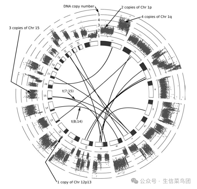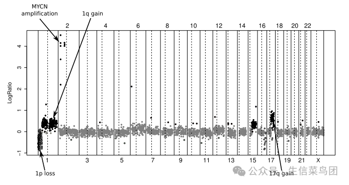 典型的 DNA 拷贝数分子特征图的图形表示如图 3.5所示:x 轴表示沿基因组从染色体 1 到 22 以及 X 的探针位置;y 轴表示 DNA 拷贝数的 -ratio 值。在 IMR32 神经母细胞瘤(neuroblastoma)细胞系的特征图中,染色体 1p² 的丢失以及由于不平衡易位导致的染色体 1q 和 17q 的增益清晰可见。小尺度改变,例如染色体 2 上的 MYCN 扩增(MYCN amplification),可以通过相对于染色体 CGH 的 aCGH 技术的高分辨率检测到。