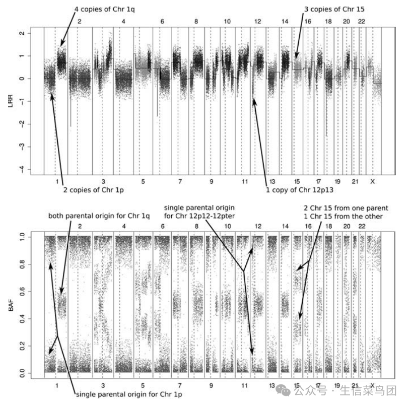 LRR 曲线显示染色体 15 存在 3 个拷贝。核型表明染色体 15 的 2 个拷贝分别与其他染色体(7 和 15)发生融合,而另一个拷贝单独存在。BAF 曲线显示来自一个亲本的 2 个拷贝和来自另一个亲本的 1 个拷贝,在有信息 SNP 上的 BAF 值约为 0.33 或 0.66。