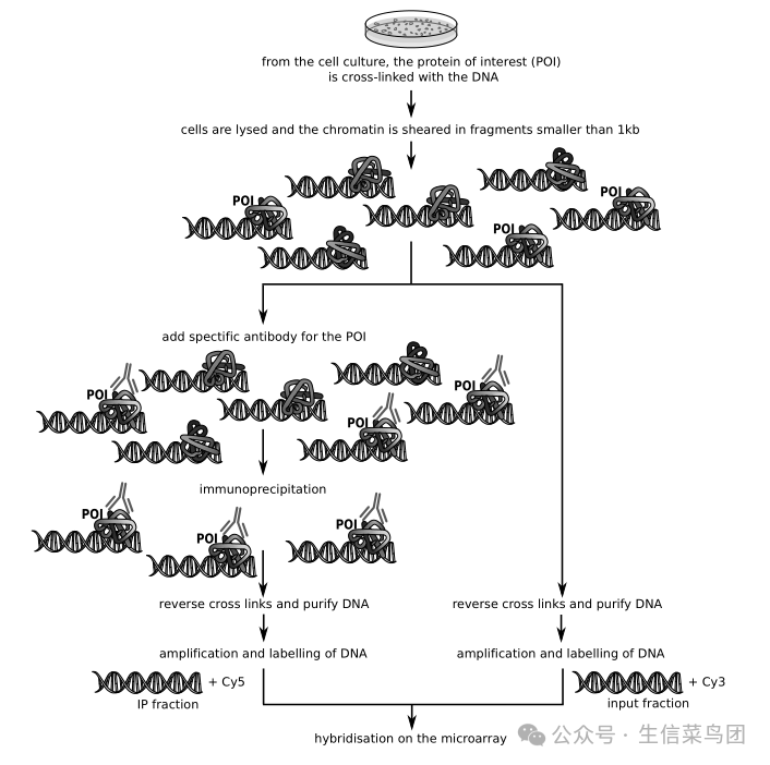 图 3.9 ChIP-on-chip 实验流程 从细胞培养物中,目标蛋白(Protein of Interest, POI)和 DNA 之间的相互作用通过免疫沉淀分离。免疫沉淀(ImmunoPrecipitation, IP)部分和输入部分均在微阵列上杂交。图像改编自 Buck 和 Lieb(2004)。