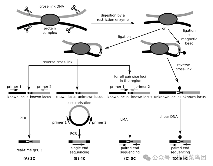 有趣的是,3C 基于的技术可以与 ChIP 联合使用,以分析特定蛋白质结合 DNA 序列之间的相互作用。这种方法称为 ChIP-loop(Simonis 等,2007)或 ChIA-PET(Fullwood 等,2010, 2009b),其工作原理如下。交联后,使用特异性抗体富集包含 POI(目标蛋白) 的 DNA 元件。其他步骤与 3C 协议相似。