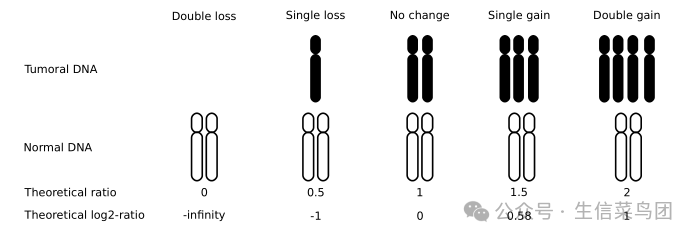 图 3.4 理论阵列-CGH 定量。 不同 DNA 拷贝数改变在肿瘤 DNA 中的理论比率和 -比率。