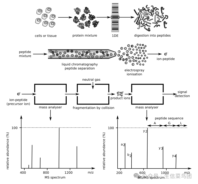 图 3.19 质谱协议 蛋白质从细胞或组织中提取,并在一维电泳(one-dimensional electrophoresis, 1DE)后选择子蛋白质组。蛋白质被消化成肽段,通过液相色谱(Liquid Chromatography, LC)分离并电离,获得质谱(Mass Spectrometry, MS)谱图和串联质谱(Mass Spectrometry/Mass Spectrometry, MS/MS)谱图。(见彩图插页)