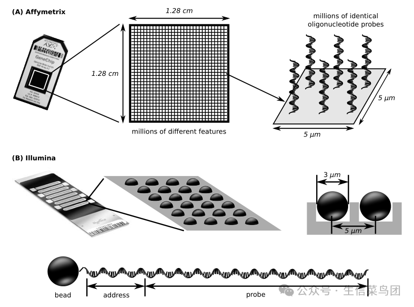 图 3.2 Affymetrix GeneChip® 和 Illumina BeadChip 设计。 (A) 芯片由一个 1.28×1.28 平方厘米的改性石英晶片组成。该表面包含约 650 万个 5 微米 × 5 微米 的特征。每个特征由数百万个相同的寡核苷酸(oligonucleotide)探针组成。寡核苷酸为 25 个碱基长的单链序列,作为基因组中已知位点的特定报告者。图片改编自 Dalma-Weiszhausz 等人(2006)。 (B) 硅珠,每个直径为 3 微米,随机自组装到中心间距为 5 微米的微孔中。每个探针在每个阵列上由平均 30-50 个珠子表示。每个珠子包含一个感兴趣的探针序列和一个地址序列,根据 Gunderson 等人(2004)描述的解码系统识别其身份。地址和探针共同代表每个珠子的特定寡核苷酸序列。每个珠子覆盖有数十万个该特定寡核苷酸序列的拷贝。图片改编自 Fan 等人(2006)和 http://www.illumina.com。