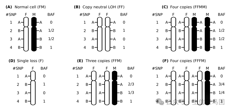 图 3.6 BAF 值的示例父源(father)染色体 F 用白色表示,母源(mother)染色体 M 用黑色表示。正常细胞状态(A)到癌细胞中可能发生的五种不同变异状态(B 到 F)均有展示,并计算每个 SNP 的 BAF 值。