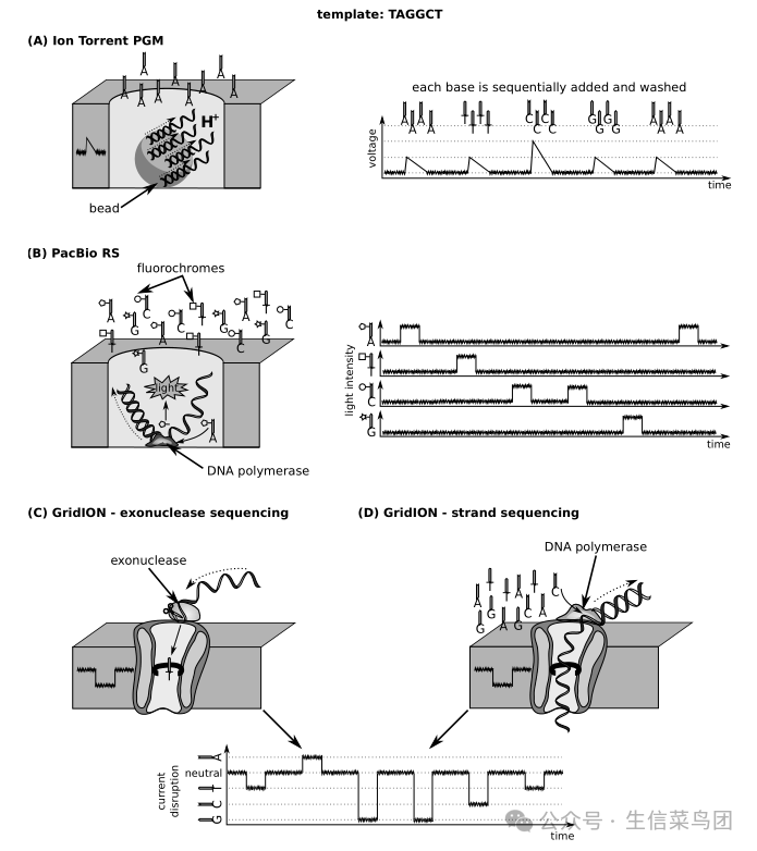 图 3.14 从第二代到第四代测序,以 TAGGCT 模板为例 (A) 第二代测序。在 Ion Torrent PGM 中,每个碱基被顺序添加并清洗。由于氢离子释放导致的电压变化,指示了已合并了多少个碱基。 (B) 第三代测序。在 PacBio RS 中,四种标记的核苷酸被添加到阵列上方。每种颜色的光强度指示了聚合酶沿着 DNA 序列合并了哪个核苷酸。 (C) 第四代测序。在 GridION 的外切酶测序中,外切酶连接到纳米孔上,从模板上逐个切割碱基。当碱基穿过纳米孔时,它暂时与适配分子结合,引起特征性的电流中断。 (D) 第四代测序。在 GridION 的链测序中,模板由于聚合反应被穿入纳米孔中。只要模板穿过纳米孔,每个碱基会像外切酶测序一样引起特征性的电流中断。 (参见彩色插页)