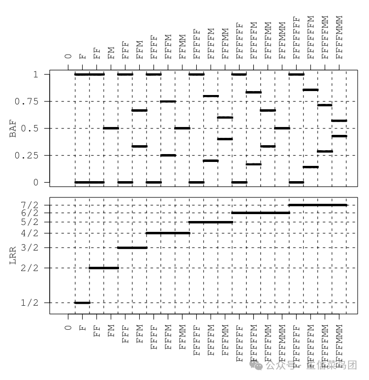 图 3.7 理论 BAF 和 LRR 值对于可能的不同变异情况,展示了理论 BAF 和 LRR 值。F 和 M 分别表示父源和母源染色体。