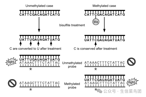 图 3.11 DNA 甲基化探针设计 在基于亚硫酸氢盐处理的方法中,为每个位点设计了两个不同的探针,以检测其甲基化状态。当探针与甲基化状态的目标位点配对时,未甲基化探针中的所有 G 核苷酸被替换为 A。根据研究位点的甲基化状态,发出或不发出荧光信号。
