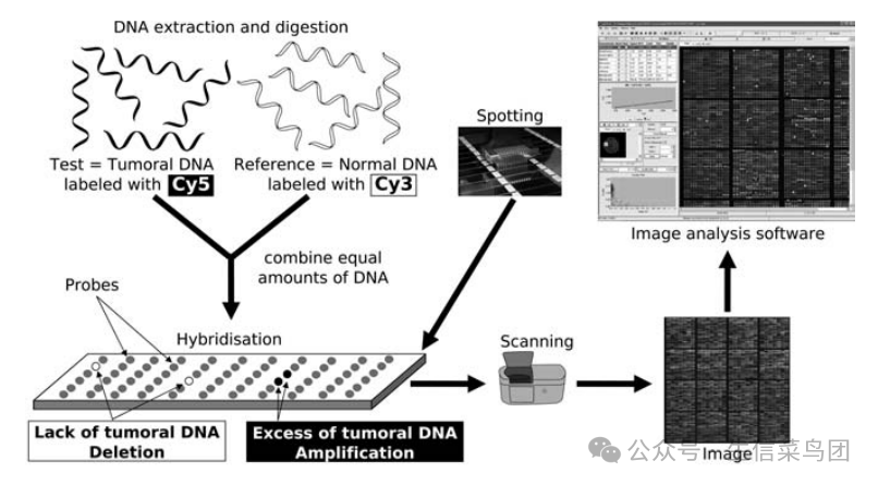 图 3.3 Array-CGH 协议。 该协议包括 DNA 的提取和标记、在芯片上的杂交、信号的扫描和图像分析以进行量化。(参见彩色插页。)