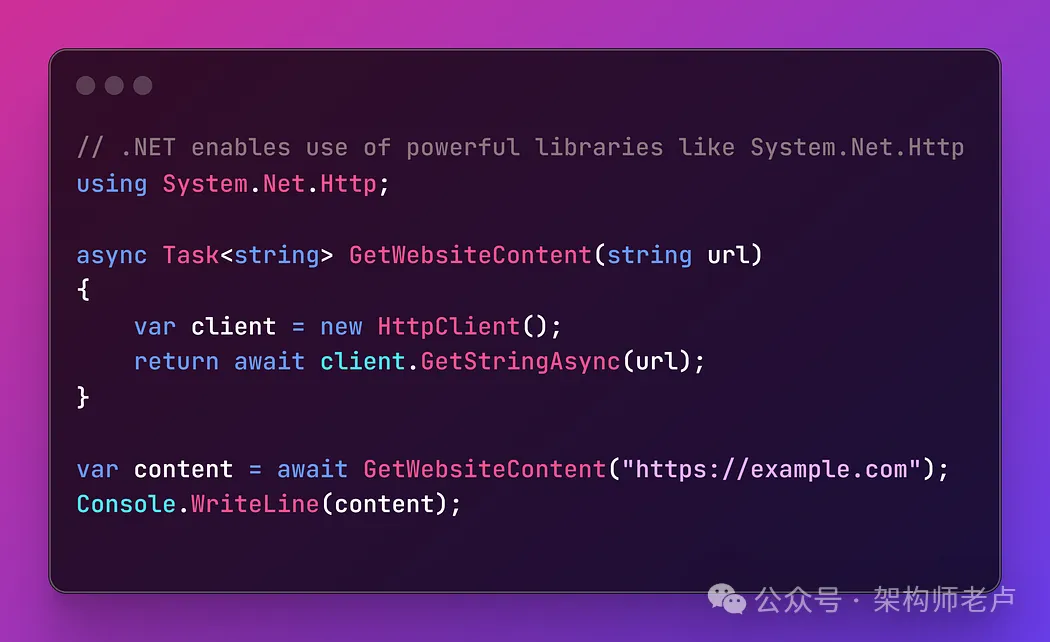 - 与 .NET 生态系统的集成使 C# 能够支持多个平台(通过 .NET Core/.NET 5+),从而提供对各种库和工具的访问。