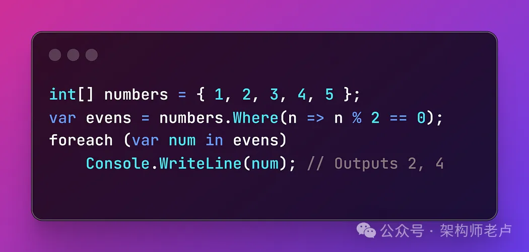 - LINQ 提供直接集成到 C# 中的查询语法,允许使用最少的样板代码高效查询数组、集合、数据库和 XML。