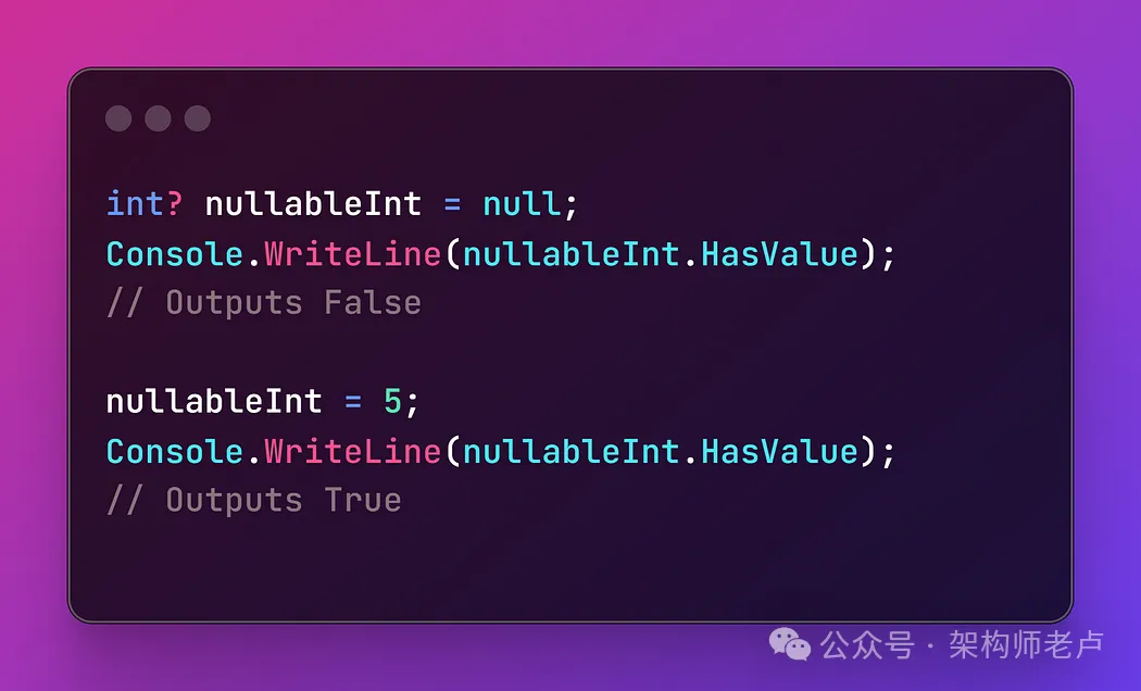 - C# 支持可为 null 的值类型 (, ),允许变量保存值,这在使用数据库时特别有用。int?bool?null