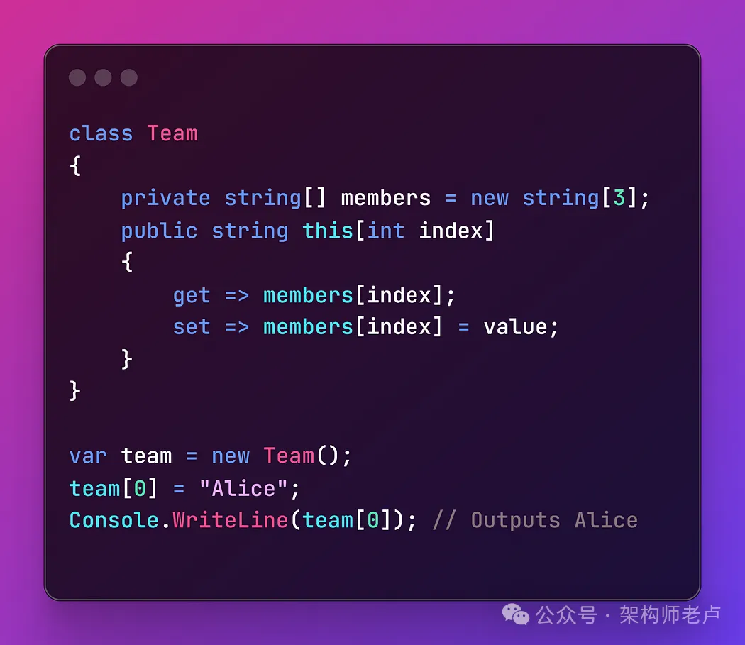 - 索引器允许像数组一样为对象编制索引,从而在类中处理集合时提供更直观的语法。