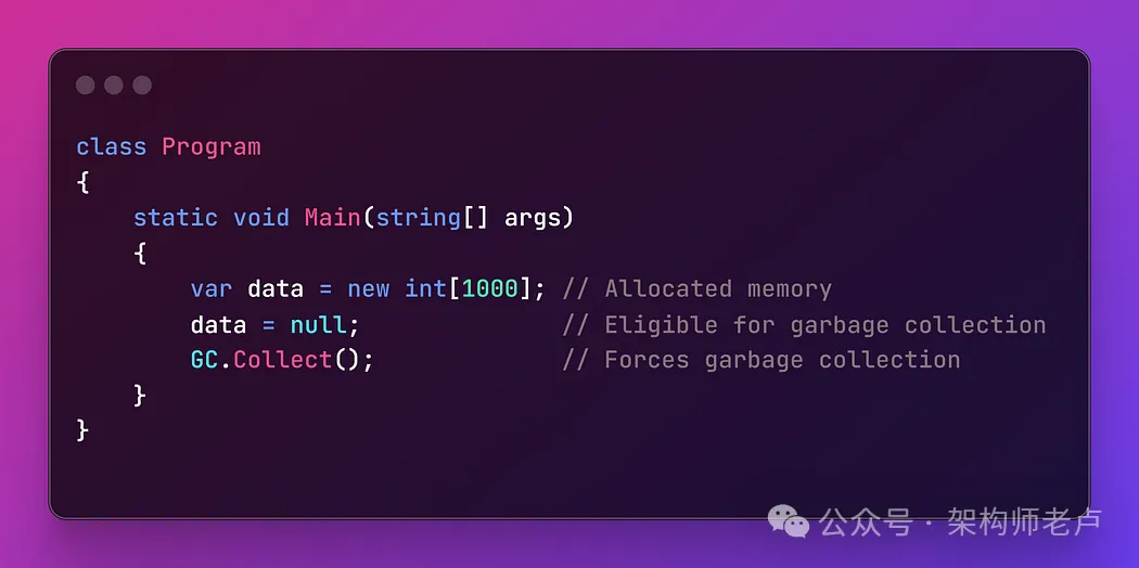 - C# 包括通过垃圾回收进行的自动内存管理,这有助于在对象不再使用时自动释放内存,从而防止内存泄漏。