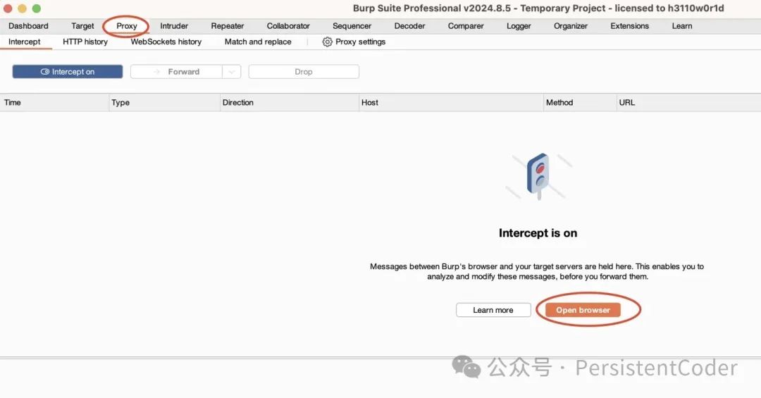 使用BurpSuite神器开启拦截,并打开内置浏览器(使用其他浏览器可通过插件自行配置):
