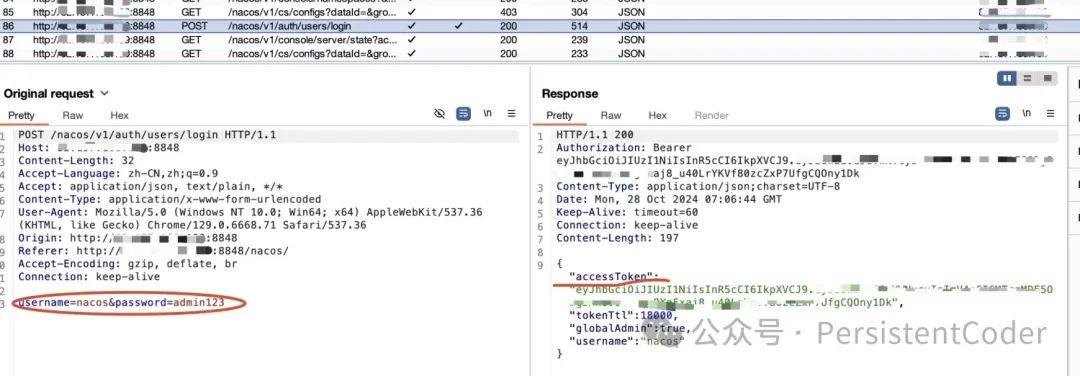 然而我们输入的账密是错误的,通过默认secretKey绕过了账密登录进入了系统后台,并且从BurpSuite拦截的请求响应中看到了正常的accessToken返回: