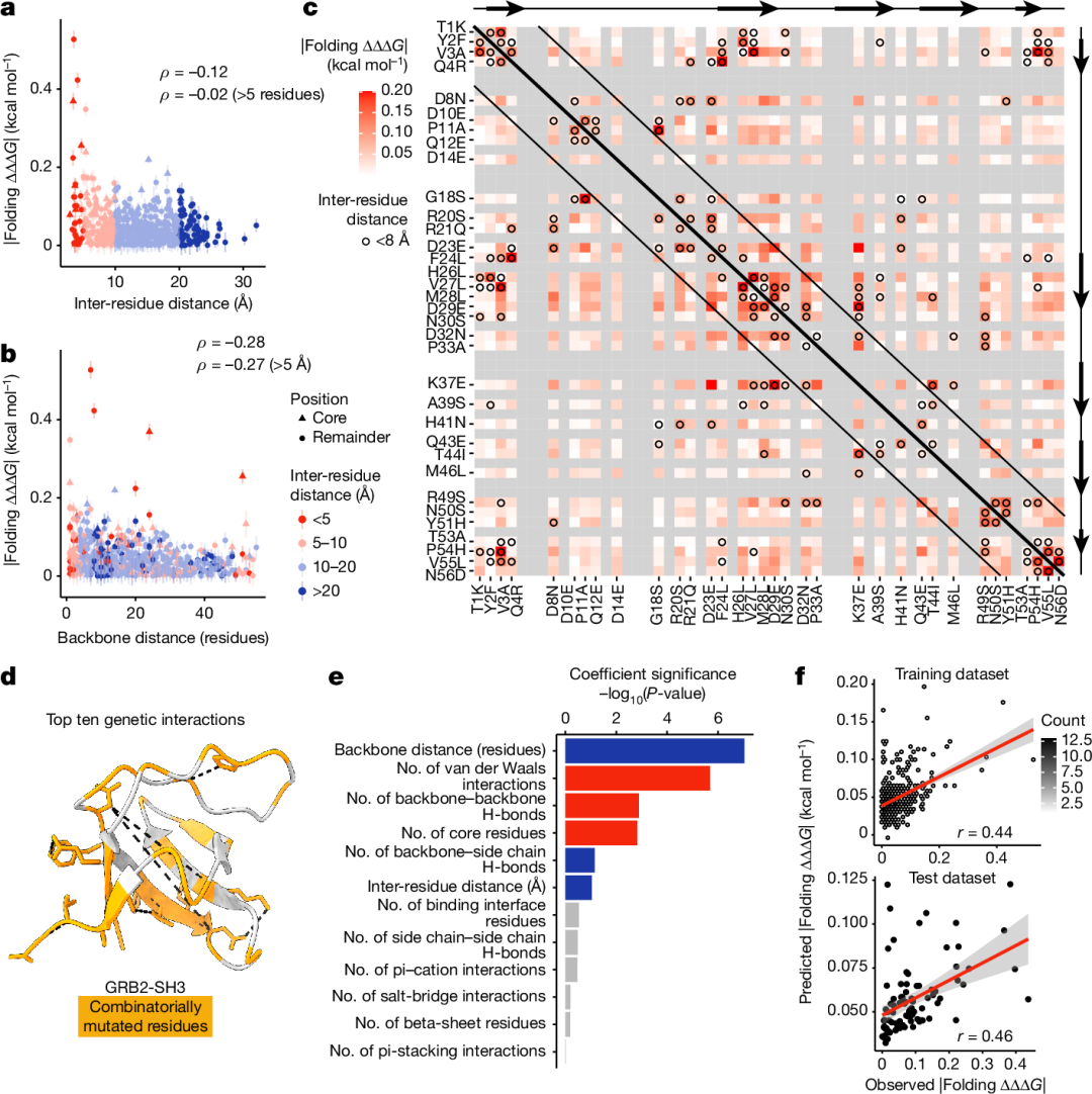 以表型水平测量,蛋白质中的遗传相互作用此前已被证明至少部分反映了蛋白质结构。结合组合深度突变扫描和热力学建模,作者推断出总共561对能量耦合,为探究其机制起源及其与蛋白质结构的关系提供了机会。将耦合能量大小(绝对折叠ΔΔΔGf)与折叠结构中突变对的三维距离(最小侧链重原子距离)进行比较,结果显示出一个L形分布,最强的能量耦合发生在结构上邻近的残基之间(图3a)。能量耦合最强的前五对残基都位于5.5Å以内,而前20对中有15对(75%)的残基距离小于8Å。尽管接触距离与耦合能量强度之间存在弱负相关关系(Spearman相关系数ρ = -0.12;见图3a),但这种趋势在主链序列上不相邻的残基对中不明显(Spearman相关系数ρ = -0.02,主链距离>5个残基)。