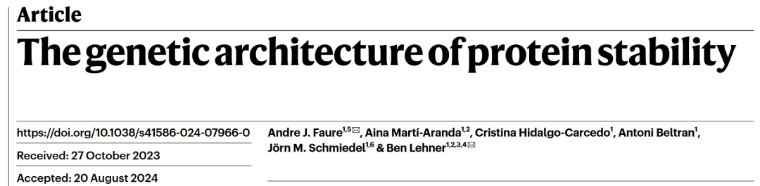 Faure, A. J., Martí-Aranda, A., Hidalgo-Carcedo, C., Beltran, A., Schmiedel, J. M., & Lehner, B. (2024). The genetic architecture of protein stability. Nature, 1-9.