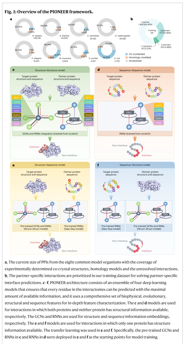 对于具有可用结构的蛋白质,PIONEER使用一种混合架构,将图卷积网络(GCNs)与自回归移动平均(ARMA)滤波器嵌入的结构信息与双向循环神经网络(RNNs)和门控循环单元(GRUs)嵌入的序列信息结合。对于没有高质量结构模型的蛋白质,仅通过带有GRUs的RNN嵌入序列信息。通过迁移学习,结构-结构模型中的预训练GCNs和RNN以及序列-序列模型中的RNN分别在结构-序列模型和序列-结构模型中应用于具有或不具有结构信息的蛋白质。此外,对于目标蛋白中的每个残基,PIONEER的独特架构结合了每个残基、整体蛋白质以及整体结合伙伴蛋白的嵌入,以实现最准确的界面预测。