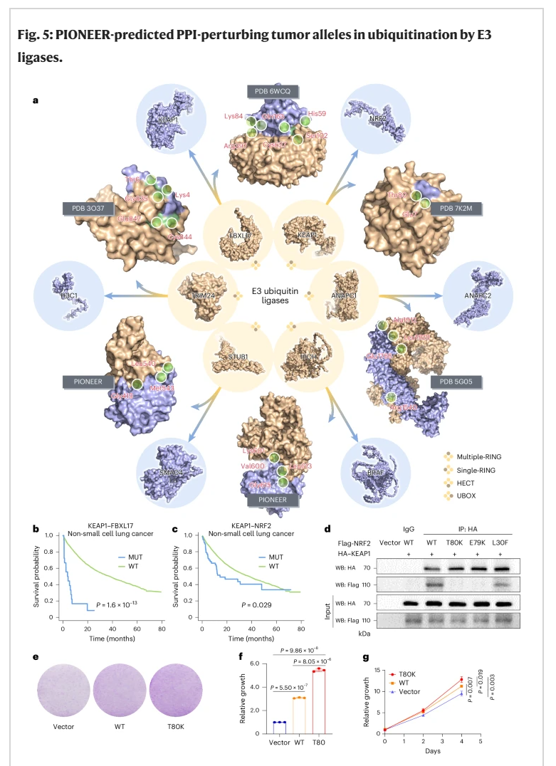 KEAP1作为E3连接酶的适配器蛋白,负责感知氧化应激并介导NFE2L2/NRF2的降解,NRF2在多种癌症中是关键的转录因子。非小细胞肺癌患者中,PIONEER预测的NRF2界面突变(如p.Thr80Lys)显著影响NRF2与KEAP1的结合,从而保护NRF2免于泛素化和降解,促进肿瘤细胞增殖。总体而言,PIONEER预测的oncoPPI突变在患者生存率、药物响应和肿瘤细胞增殖中均表现出显著关联。
