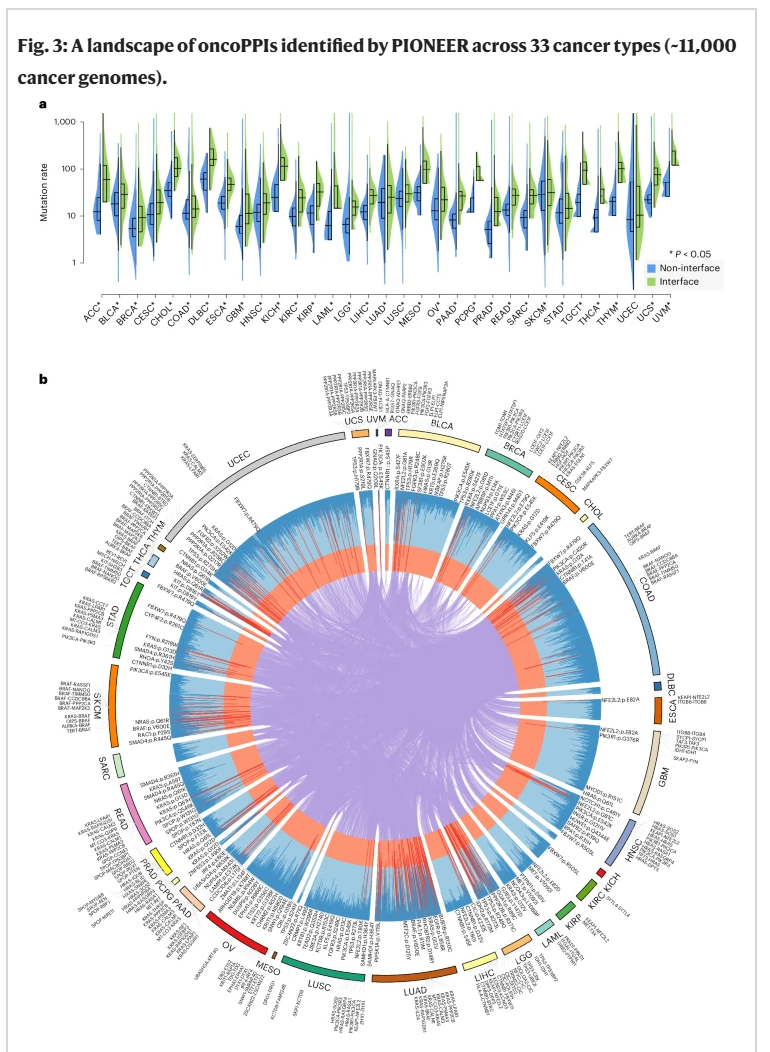 为了推动基因发现向疾病发病生物学和治疗发现的转化,研究人员提出了一种集成深度学习框架,称为PIONEER(Protein–protein InteractiOn iNtErfacE pRediction),可预测人类及七种常见模式生物中已知蛋白质相互作用的结合位点特异性界面,从而生成全面的结构信息驱动的蛋白质相互作用组。研究人员证明了PIONEER在预测精度上优于现有的先进方法,并通过实验验证了其预测结果。研究表明,疾病相关突变在PIONEER预测的蛋白质相互作用界面中富集,并探讨了这些突变对疾病预后和药物响应的影响。通过对约11,000个全外显子组的分析,研究人员发现586个显著的蛋白质相互作用(PPI)富含PIONEER预测的界面体细胞突变(称为oncoPPIs),并显示这些oncoPPIs与患者生存率和药物响应具有显著关联。PIONEER既作为一个网络服务器平台,也作为一个软件包实现,可识别疾病相关等位基因的功能后果,提供一种适用于精确医学的多尺度相互作用组网络深度学习工具。