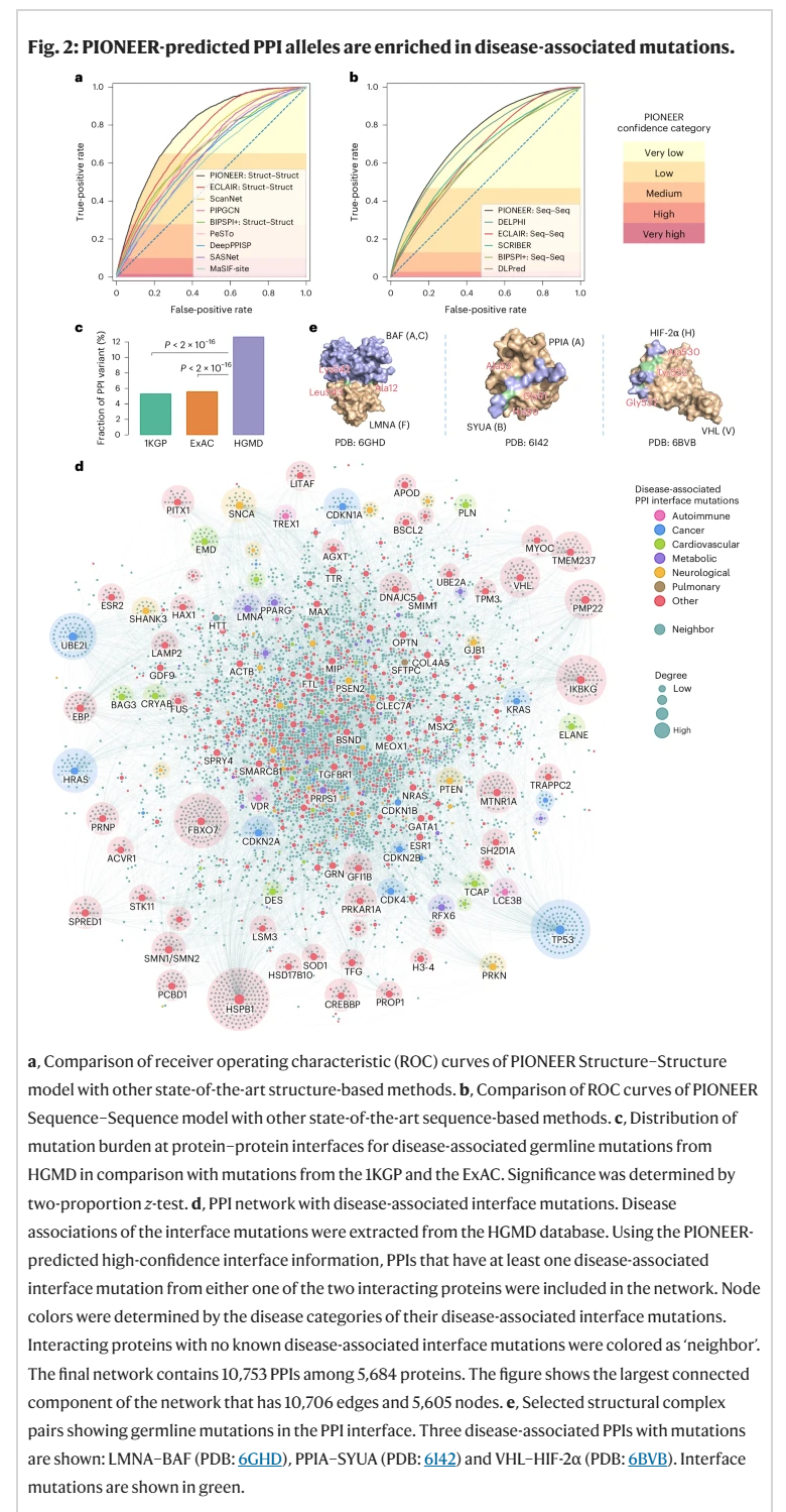 为了进一步评估疾病相关突变在PIONEER预测的PPI界面中的富集情况,研究人员将HGMD中的疾病相关生殖系突变分为七大疾病组,包括自身免疫、癌症、心血管、代谢、神经、肺部以及其他类别。研究人员识别了10,753个PPI,其中5,684种蛋白质至少含有一个疾病相关的界面生殖系突变,其中约91%的相互作用在一侧蛋白质上含有界面突变(另一蛋白质标记为“邻近”),约9%在相互作用双方蛋白质上均有界面突变。这一网络分析显示,PIONEER预测的PPI界面因广泛的疾病相关突变而发生改变,跨越多个疾病类别。为突显PIONEER预测界面的功能,研究人员进一步分析了三种具有生殖系等位基因的PPI界面:LMNA和BAF的界面中的p.Lys542Gln突变与早衰症相关;PPIA–SYUA界面中的p.Ala53Glu突变与早发性帕金森病患者相关;HIF-2α界面中的p.Gly537Arg突变与真性红细胞增多症相关,并通过抑制HIF-2α的泛素化和蛋白酶体降解来破坏VHL结合。这些结果表明,PIONEER预测的蛋白质相互作用界面突变在分子和等位基因层面上提供了关键结构信息,有助于解析疾病机制的功能后果。