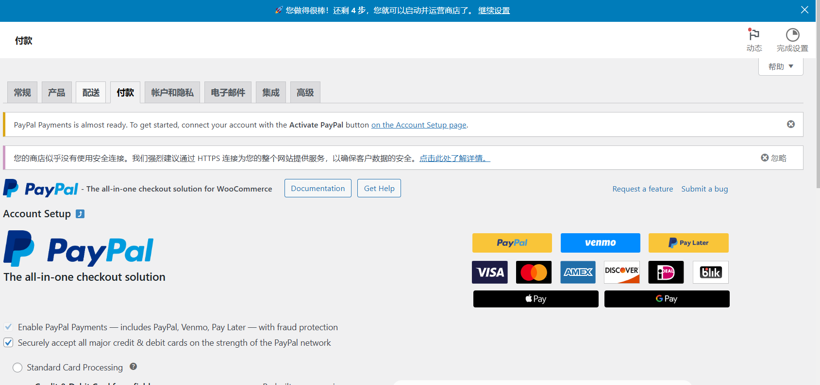 这里我们点击顶部的【继续设置】回到 WooCommerce 菜单对应页面,选择添加收款方式 中的【查看选项】,进入设置付款方式页面