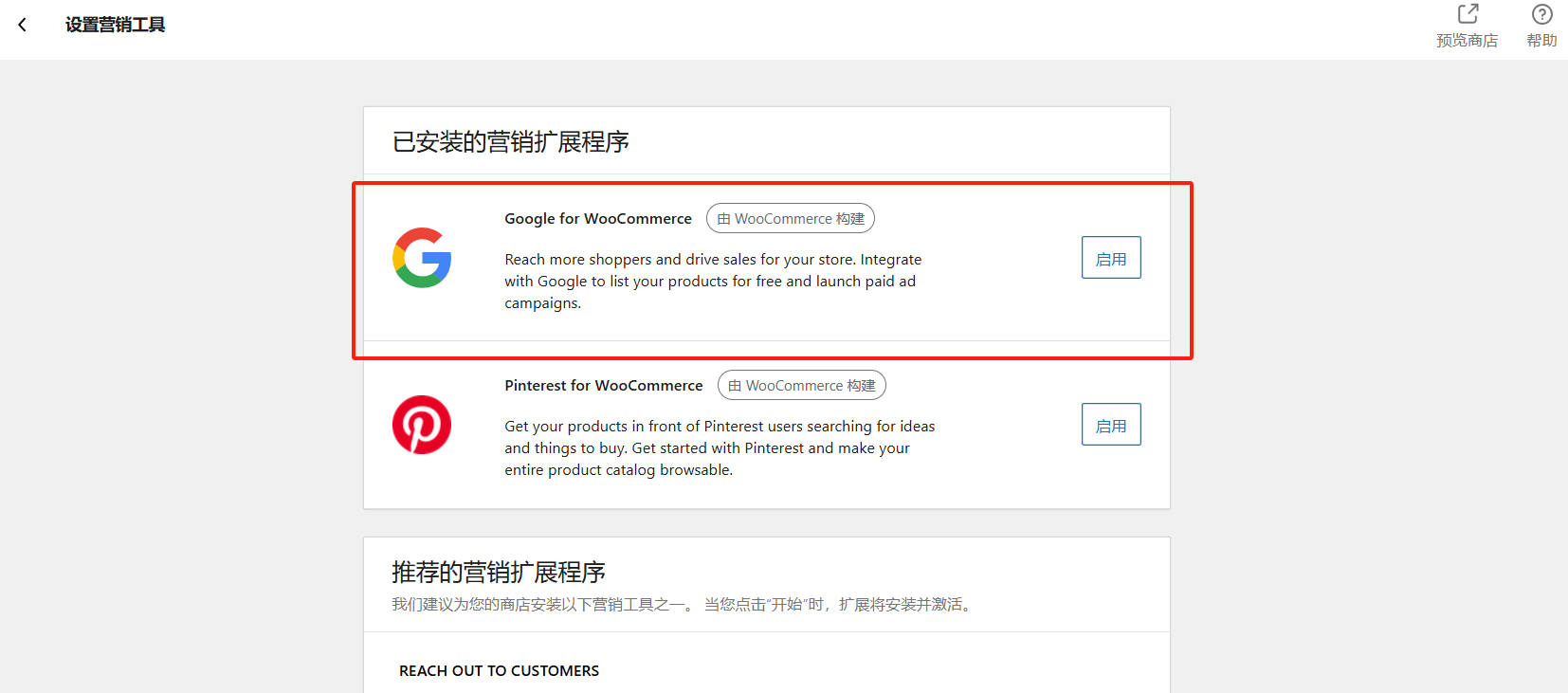 完成税率设置之后,我们可以继续选择左侧导航栏中的 WooCommerce,单击提升销售额中的【添加销售渠道】,根据实际需求,并按照页面提示选择推荐的营销扩展程序,这里我直接选择【已安装的营销拓展程序】,点击【启用】完成销售渠道的设置