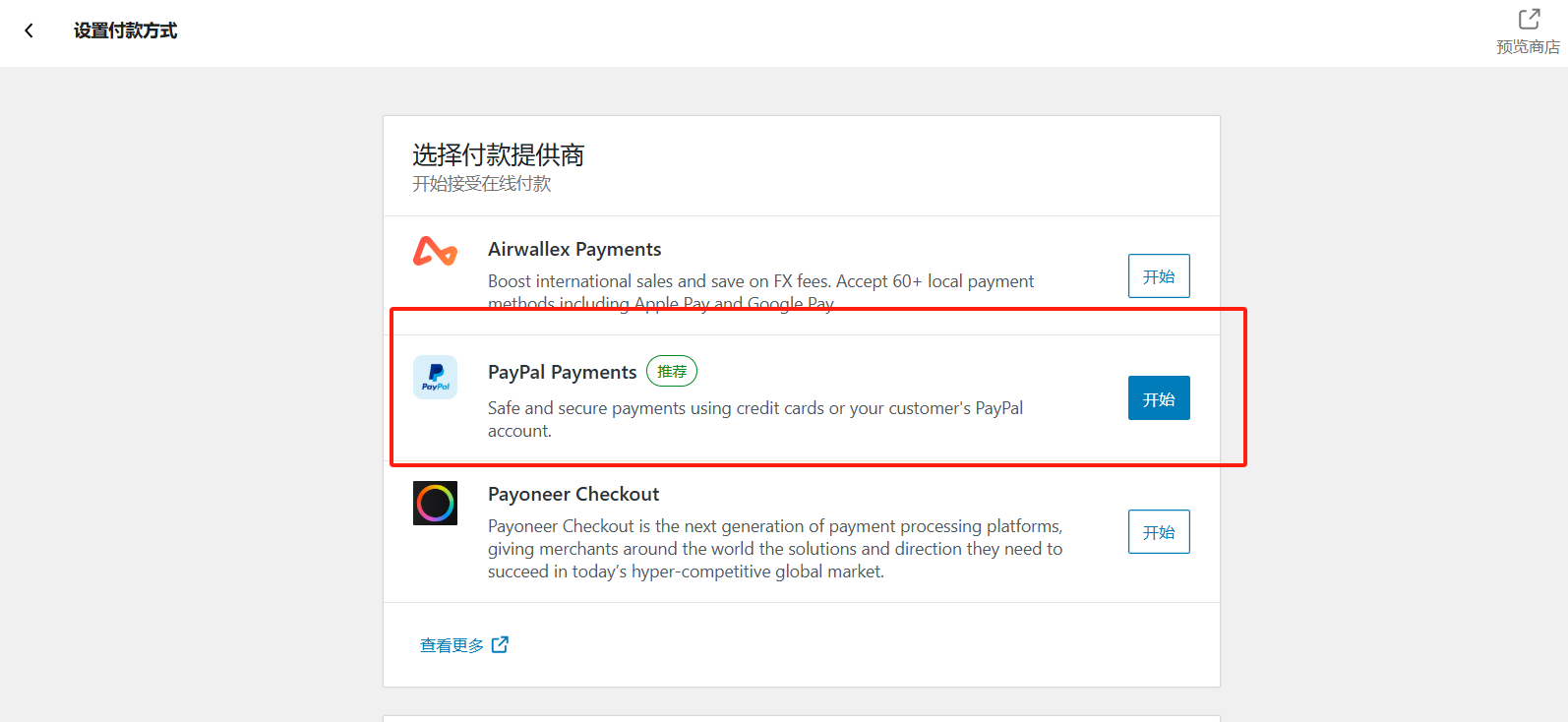 在选择付款提供商页面,我选择推荐的付款提供商,点击【开始】