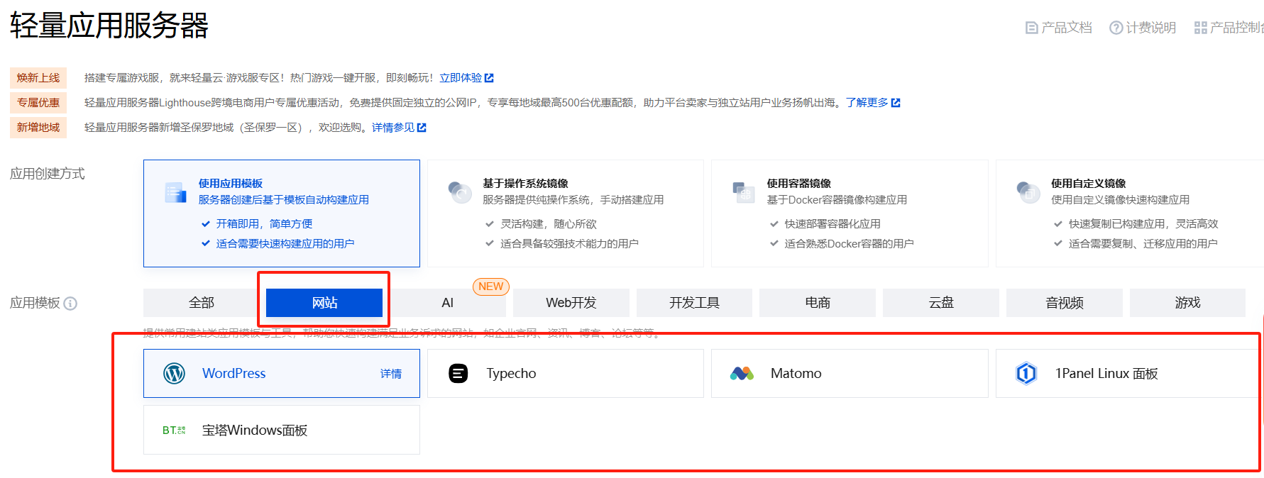 轻量应用服务器为企业提供常用建站类应用模板,快速构建满足业务诉求的网站,例如企业官网、资讯、博客、论坛、电商等,比如WordPress、Typecho、宝塔面板。
