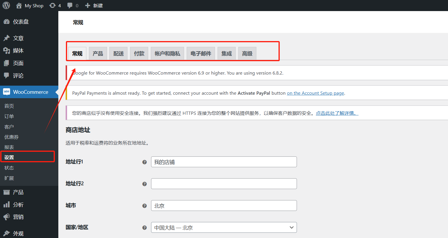 最后,也可以通过选择左侧导航栏中的 WooCommerce,点击【设置】完成对商铺的一些其他信息的设置,包括产品、配送、付款、账户和隐私等内容的设置