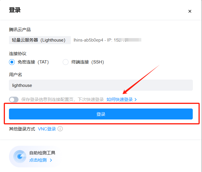 cat ~lighthouse/credentials.txt点击复制命令后面的【登录】或者右上角的【登录】登录服务器,这里需要进行身份验证,身份验证通过后在弹出页面默认选择后点击【登录】登录云服务器