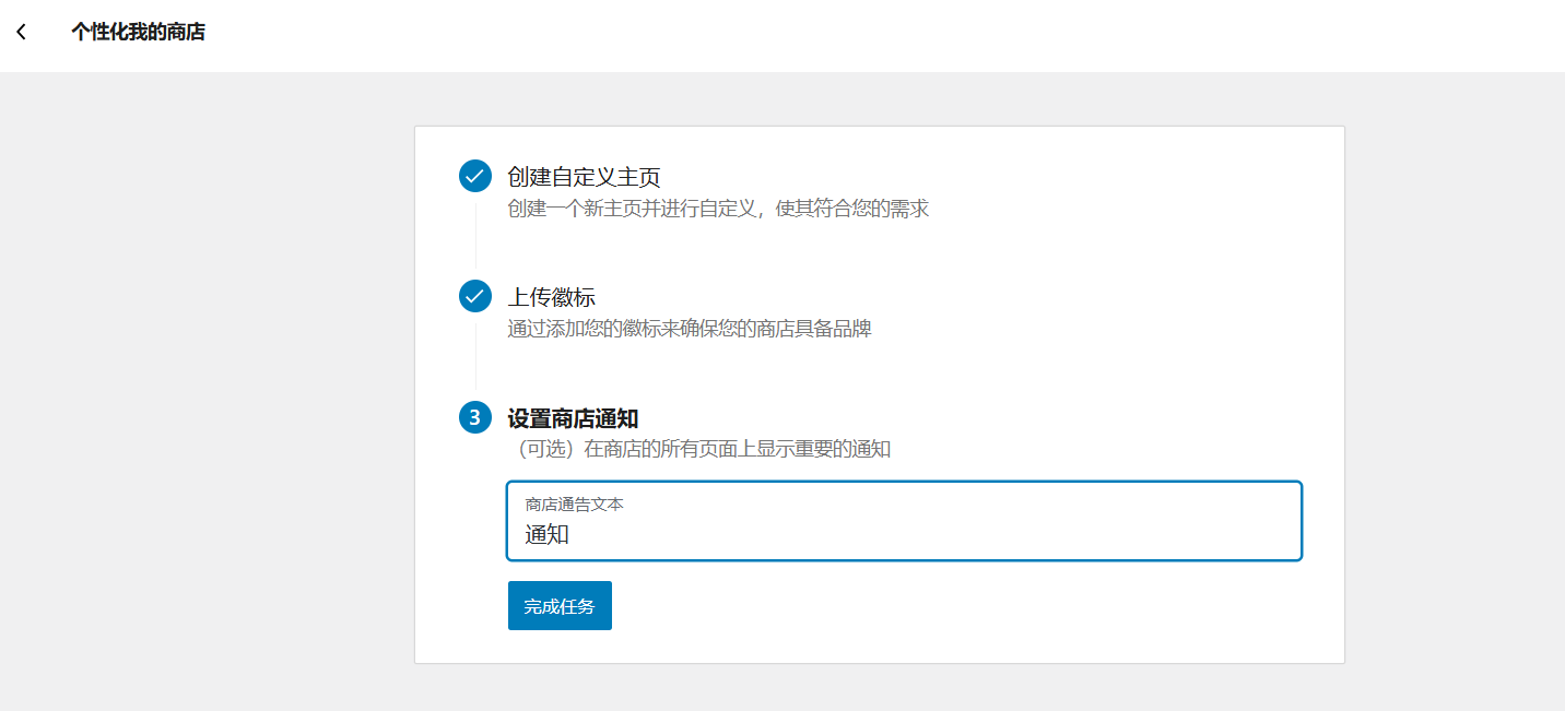 最后就可以为我们的商店进行个性化设计,选择左侧导航栏中的 WooCommerce,单击让您的商店脱颖而出中的【个性化】,进入个性化我的商店页面,可以设置一个客户主页,并且能够上传独立站 Logo 和公告信息,或者也可以跳过