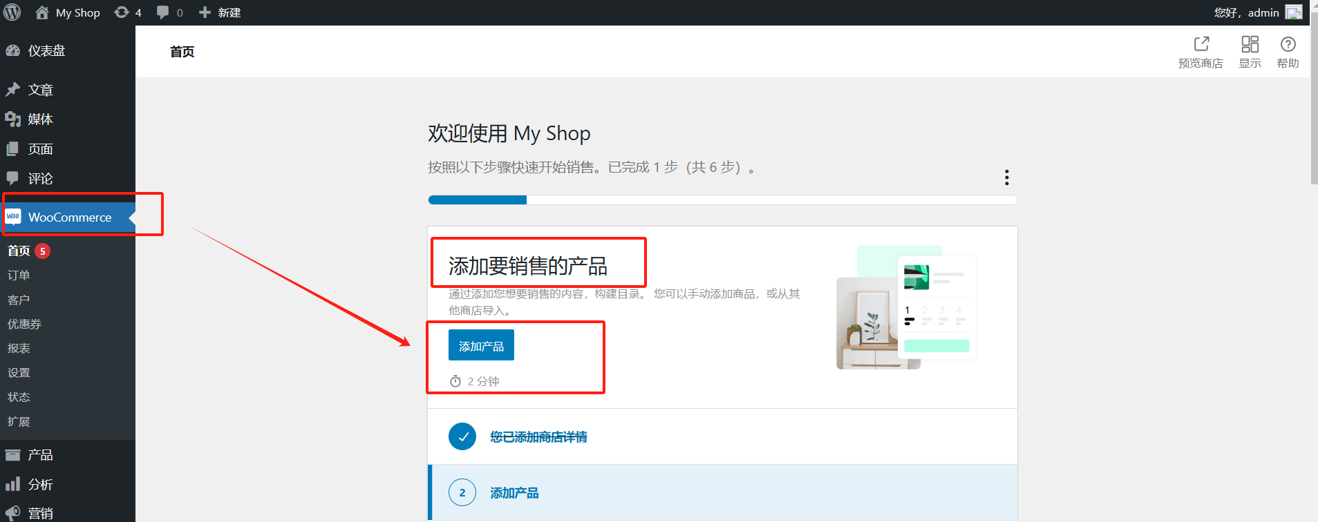 在后台管理页面中,选择左侧导航栏中的【WooCommerce】 ,单击 添加要销售的产品 中的【添加产品】