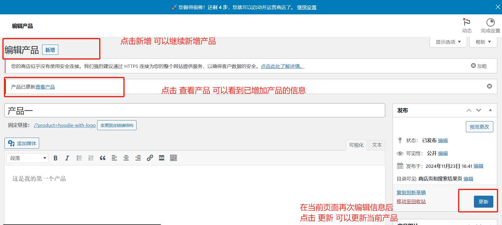 在编辑产品页面中,按需设置产品名称、产品描述、产品类型、产品价格、产品图片及产品标签等产品信息。