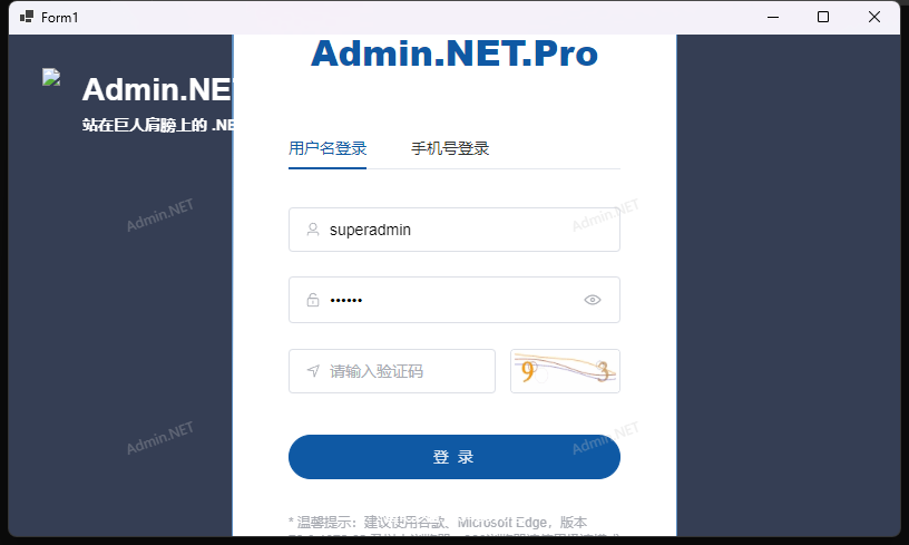 以客户端 WinForm 桌面程序模式直接运行 Admin.NET,免去手动配置 Web 服务的繁琐步骤,方便给别人演示,可以当做单机软件使用了。