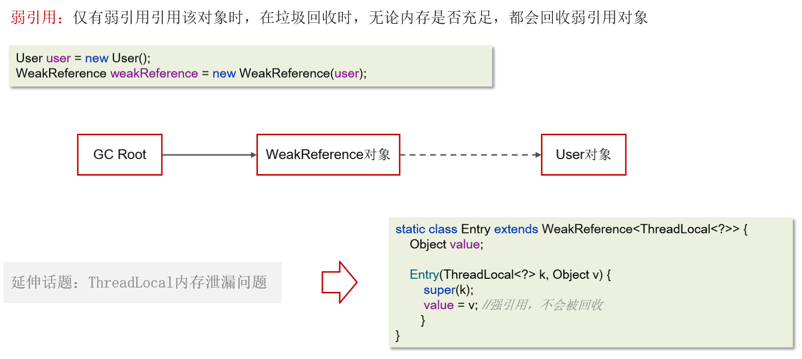 弱引用可以和一个引用队列(ReferenceQueue)联合使用,如果弱引用所引用的对象被垃圾回收,Java虚拟机就会把这个弱引用加入到与之关联的引用队列中。