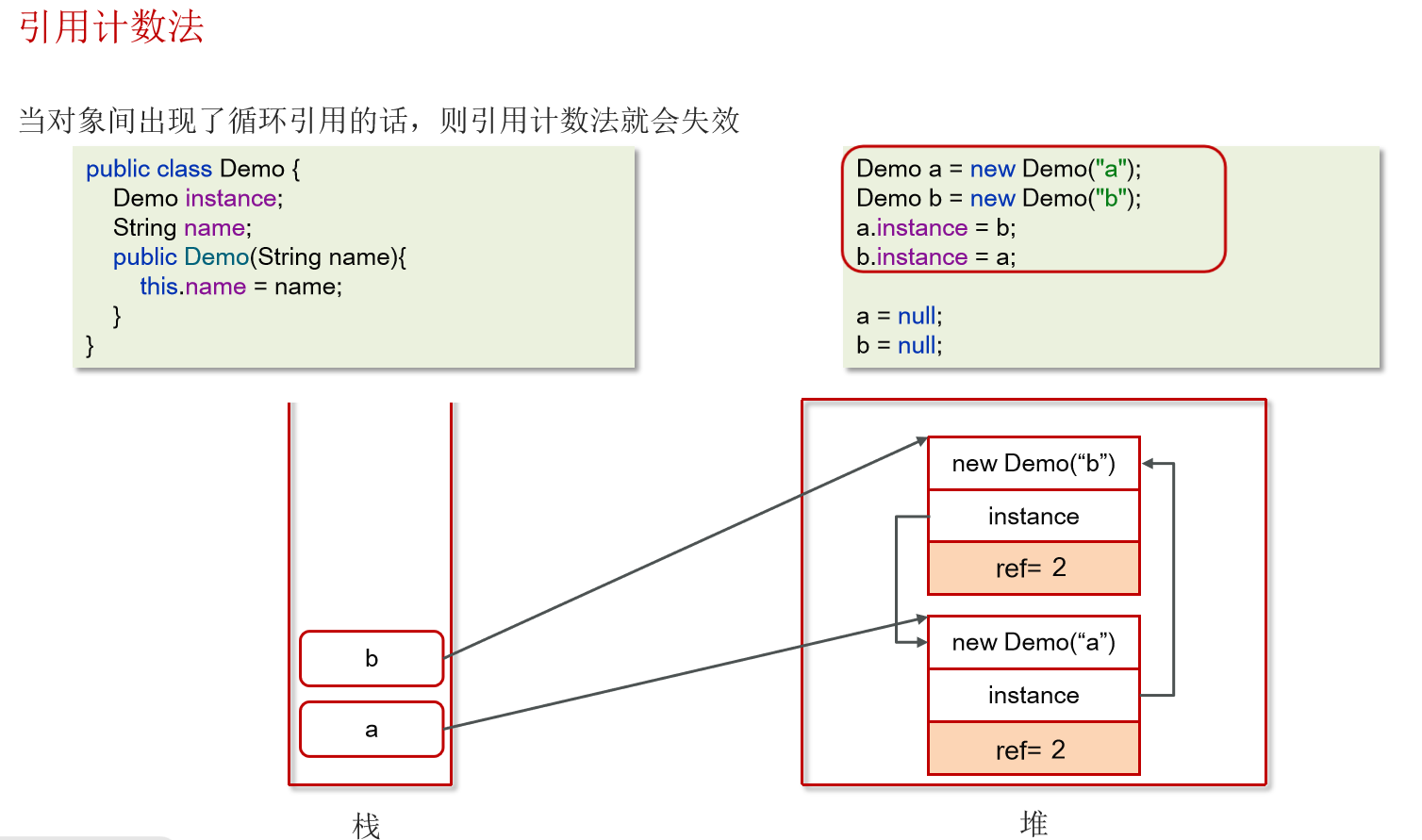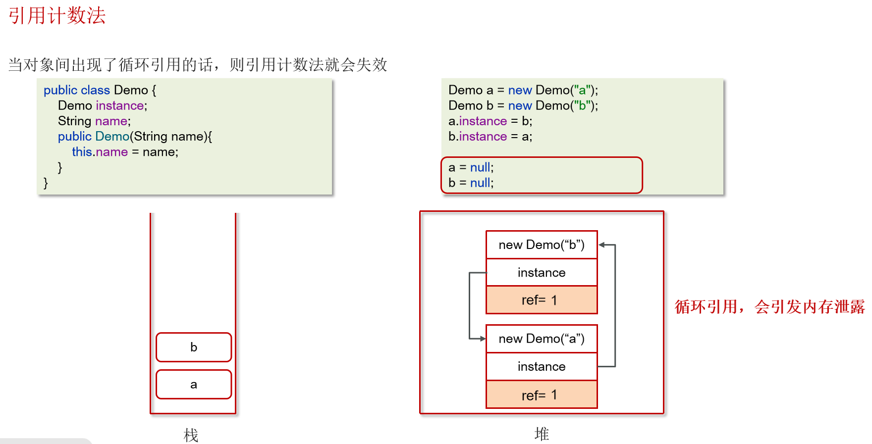 当对象间出现了循环引用的话,则引用计数法就会失效。