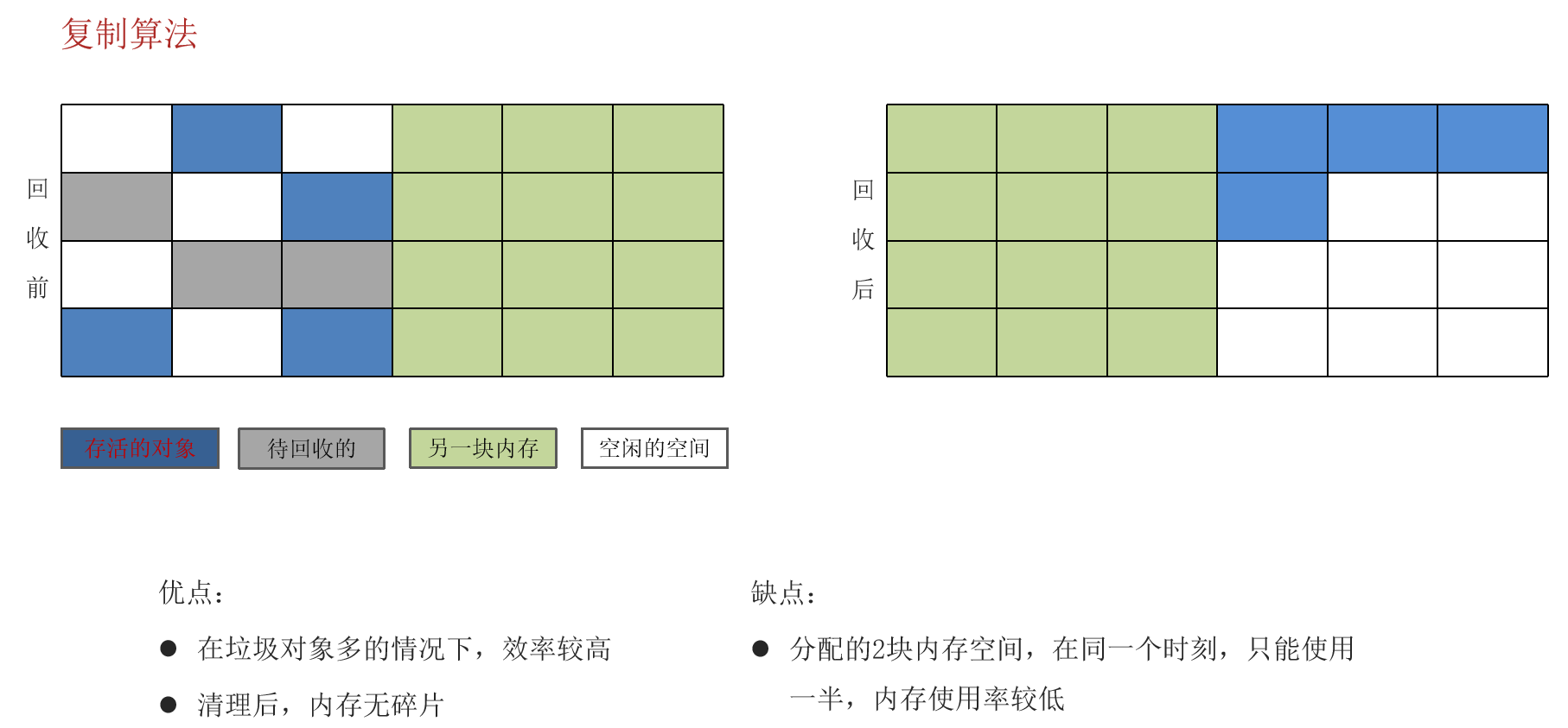 复制算法(Copying)将内存分为大小相同的两块,每次使用其中的一块。当这一块的内存使用完后,就将还存活的对象复制到另一块去,然后再把使用的空间一次清理掉。这样就使每次的内存回收都是对内存区间的一半进行回收。