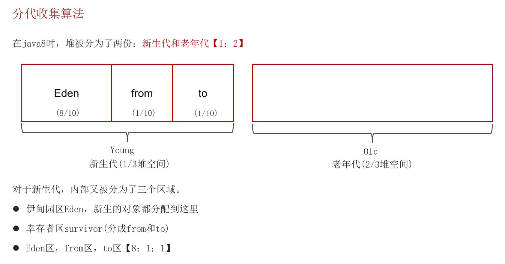 在java8时,堆被分为了两份:新生代和老年代【1:2】。