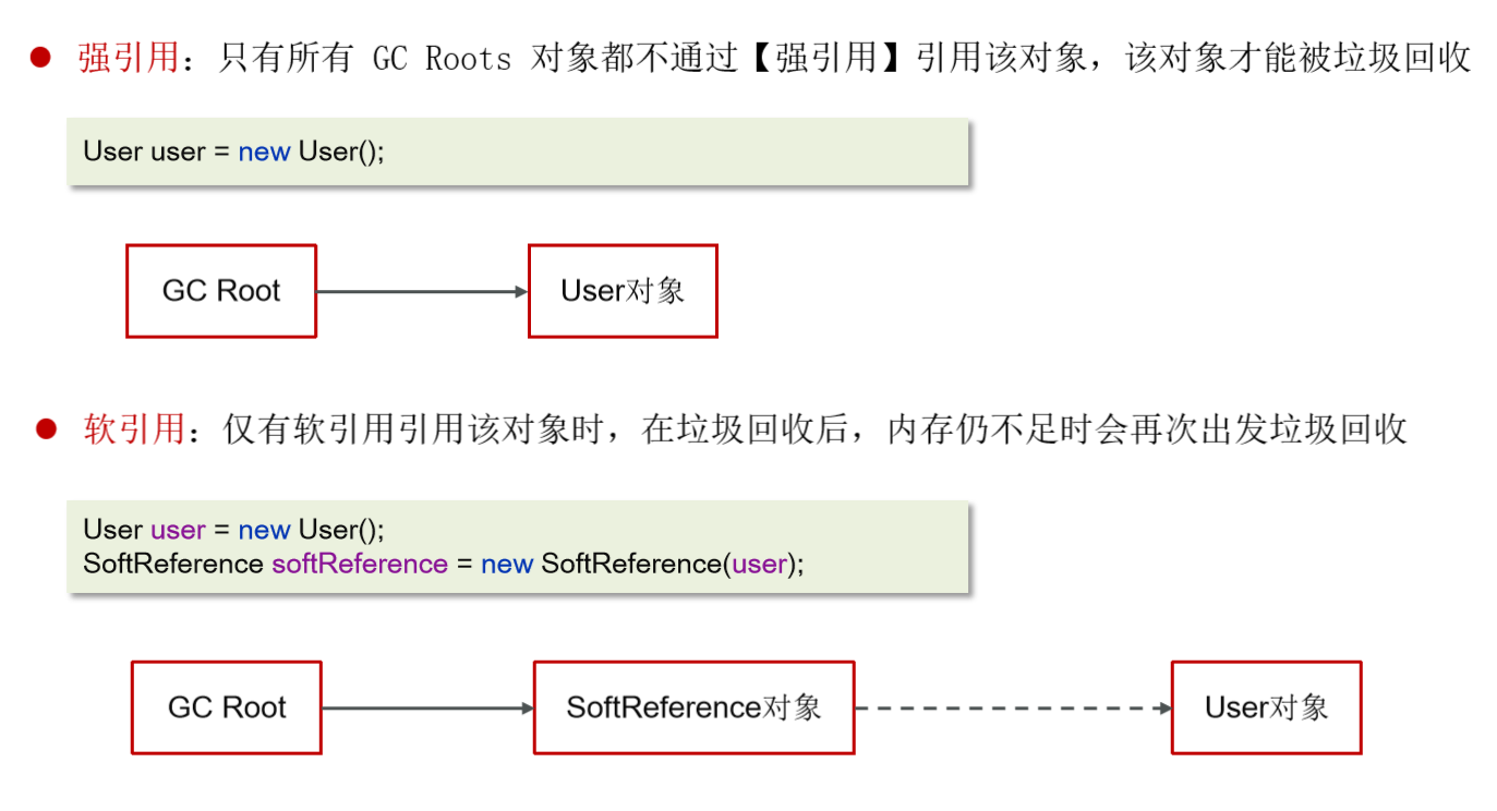如果一个对象具有强引用,那就类似于必不可少的生活用品,垃圾回收器绝不会回收它。当内存空间不足,Java虚拟机宁愿抛出OutOfMemoryError错误,使程序异常终止,也不会靠随意回收具有强引用的对象来解决内存不足问题。