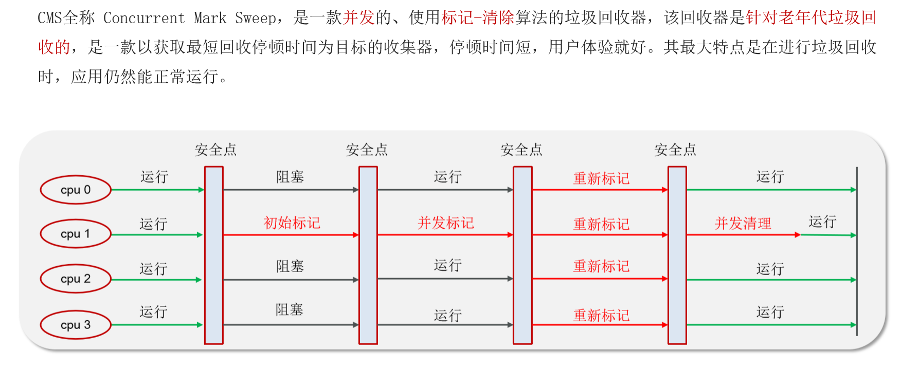CMS全称 Concurrent Mark Sweep,是一款并发的、使用标记-清除算法的垃圾回收器,该回收器是针对老年代垃圾回收的,是一款以获取最短回收停顿时间为目标的收集器,停顿时间短,用户体验就好。其最大特点是在进行垃圾回收时,应用仍然能正常运行。